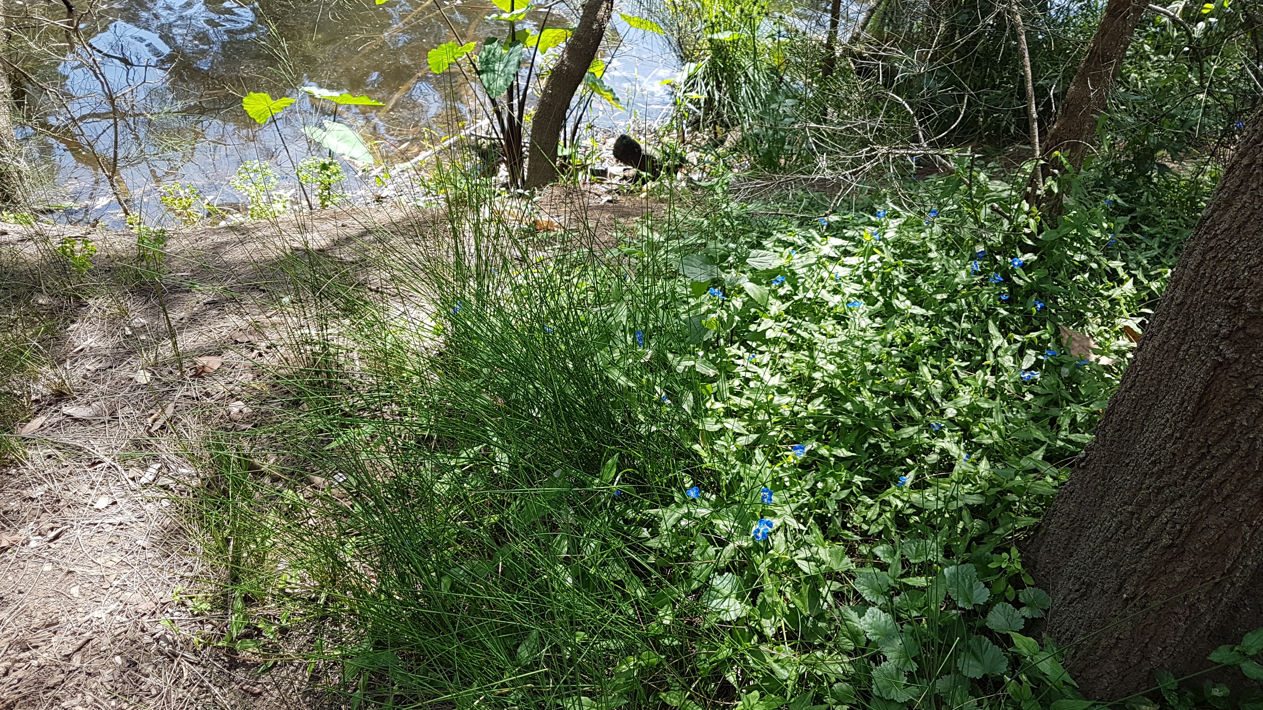 강가 옆에 연잎같이 생긴 잎사귀와 나무 옆에 보라색 이쁜 꽃이 내 발걸음을 멈춘다.